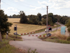 Železniční přejezd přejíždí taxi na červená světla pod padajícími závorami.