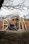 Vlevo je dům rodičů, vpravo od něj jsou domy, které otec Imrich staví pro své dcery Evu a Janu - víceméně proti jejich vůli.