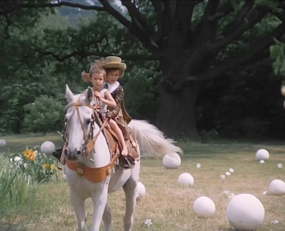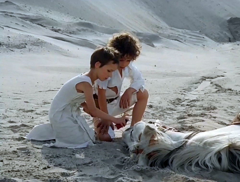 V dalším záběru kůň vyskočí na nohy. Obě děti mírně překvapeně uskočí stranou. Zřejmě jsou překvapení tim, jak rychle může tak těžké zvíře vstát.